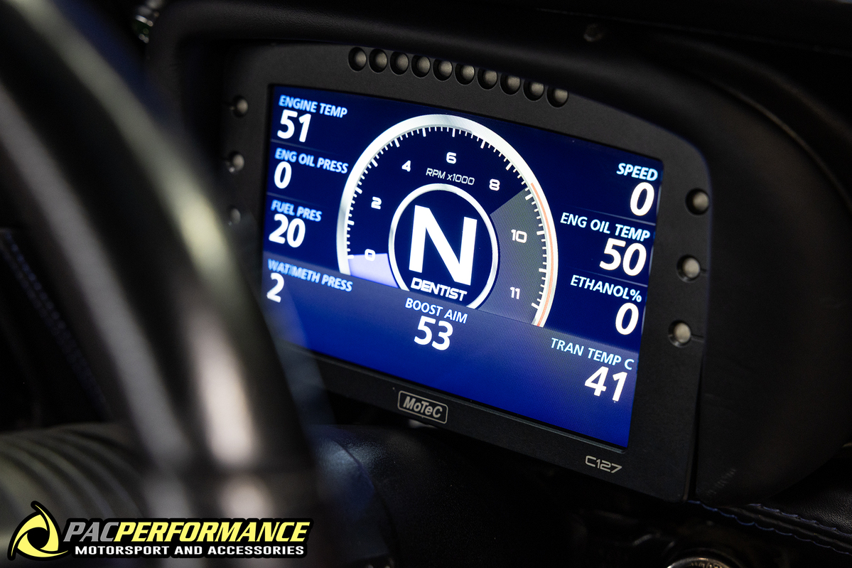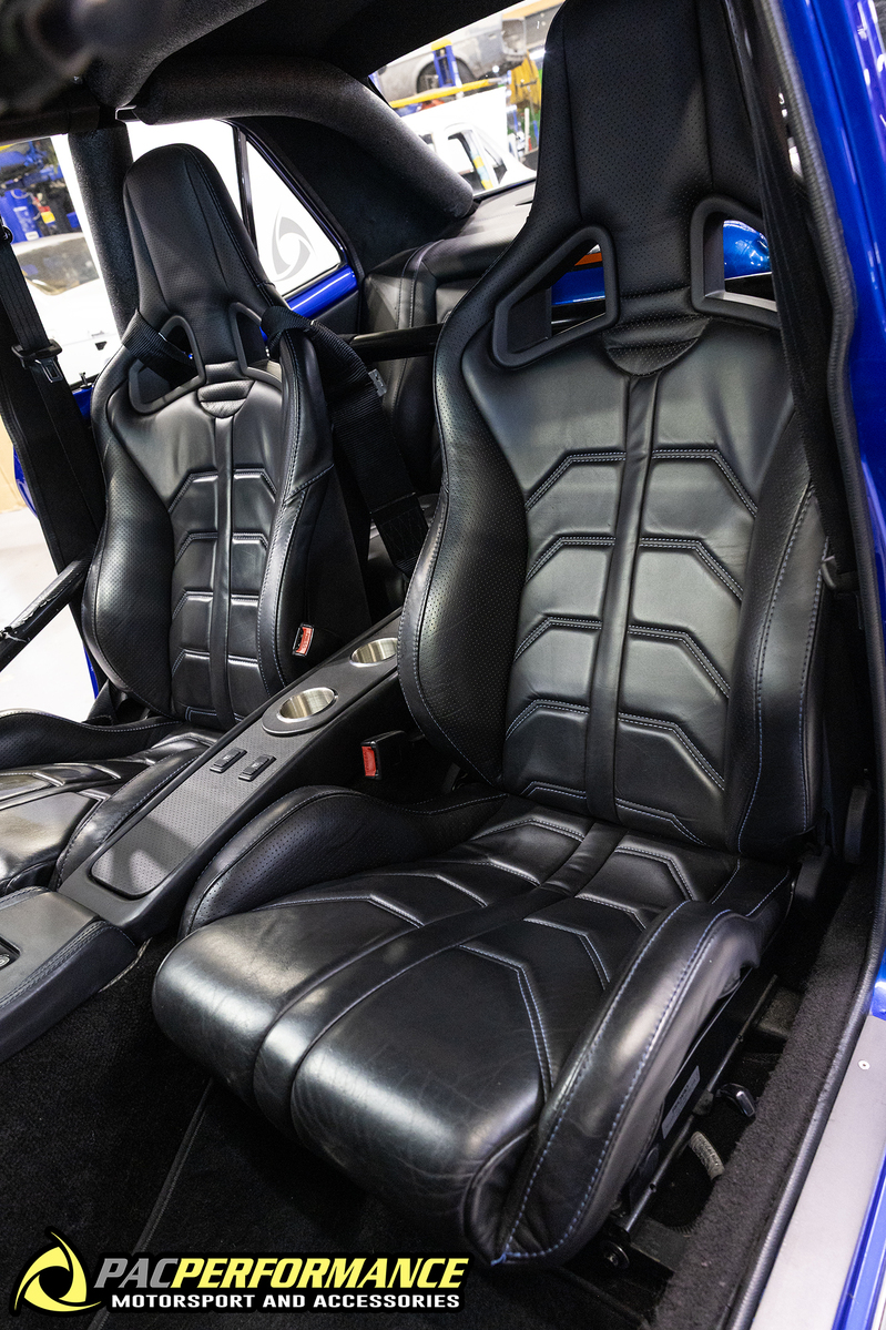 Interior: Custom leather trim, Recaro Sportster CS Seats & custom molded rear seat & console, MoTeC C127 Dash, Paddle Shift System, Momo Fighter Steering Wheel & Full cage with removable front