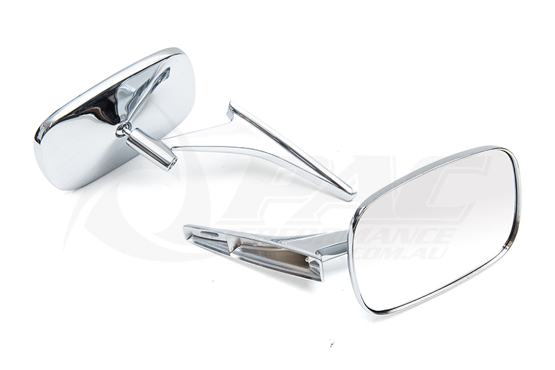 High-quality Universal Chrome Plated Rectangle Side Mirrors - perfect for restoration & custom car builds, retaining that old school factory look for your early model Mazda whilst also providing a stable, easily-adjustable view. Sold as a pair (L&R) and supplied with gasket seal, mounting bracket and hardware.