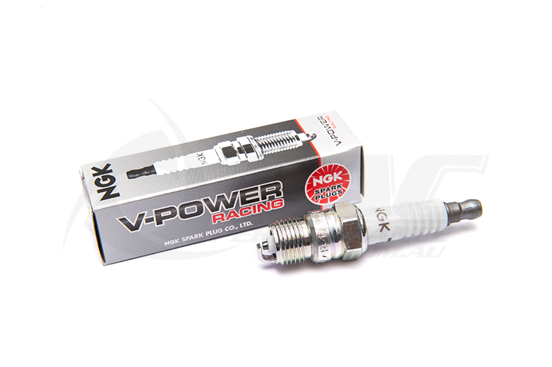 Specialized V-Power racing spark plug designed for high-performance engines, featuring a copper core and nickel alloy electrode to withstand harsh racing conditions.