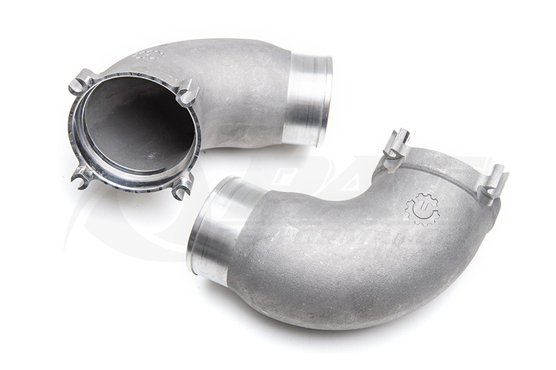 Turblown DBW elbow for both 82mm Bosch throttle bodies. O ring connection with 4 allen head bolts at TB side, 3" hose connection for inlet. This is a cast bare aluminum unit.